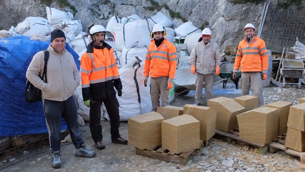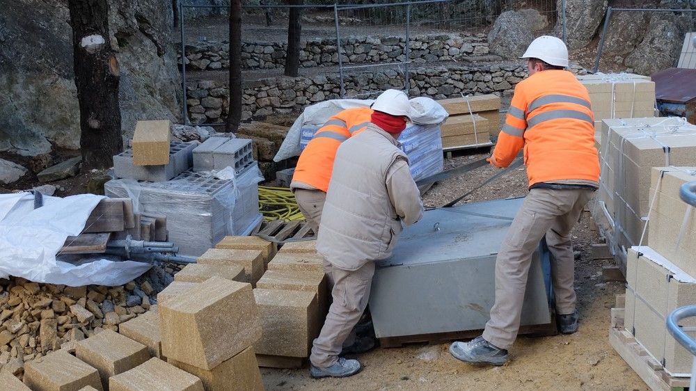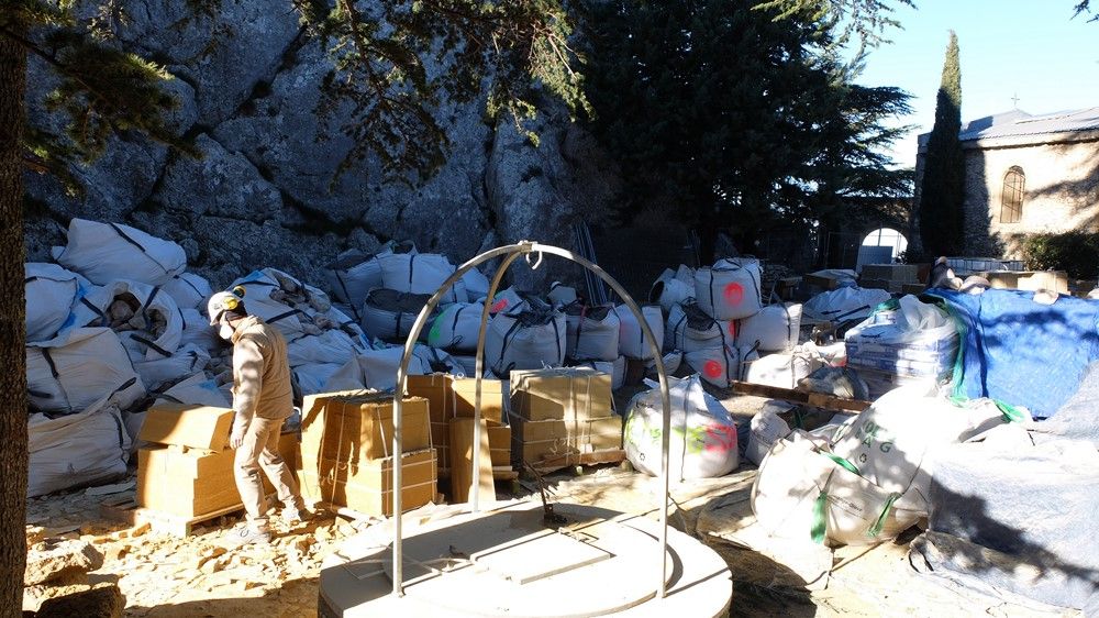 Une petite dizaine de rotations suffiront pour déposer des big bags d’outils et de tubes, les bacs aciers pour la couverture, de grandes planches pour confectionner le coffrage de la voûte, une armoire métallique, des parpaings, du sable, et une palette de pierre taillées supplémentaire. La semaine précédente, nous avaient déjà été héliportées des palettes de pierres de Pondres pour le sol et de pierre de Vers pour la corniche du cloître.