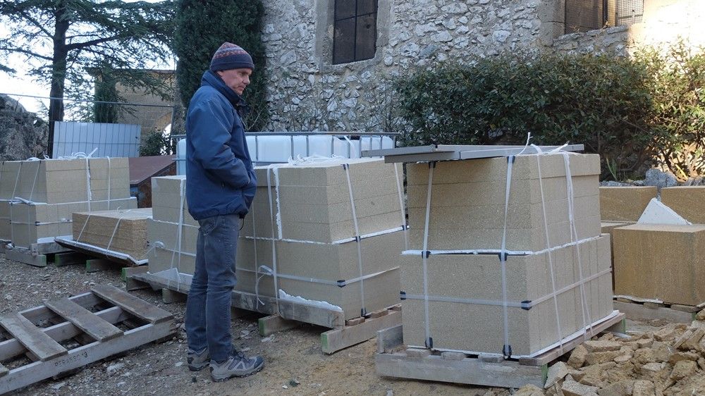 Pendant ce temps, Arthur taille des pierres de Vers pour compléter les encadrements des 2 fenêtres du cloître.